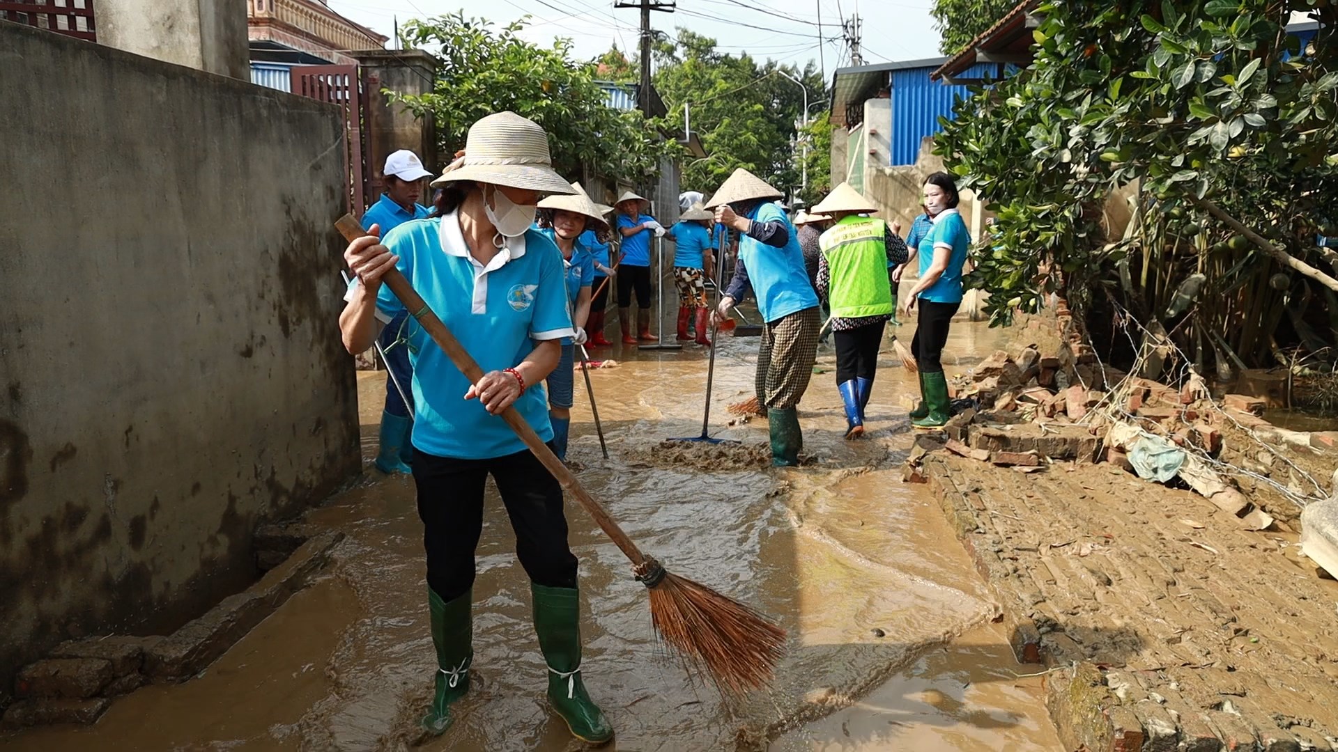 Cán bộ, hội viên Hội LHPN các cấp thành phố tích cực hỗ trợ bà con Nhân dân các địa phương dọn dẹp vệ sinh môi trường sau bão lũ.